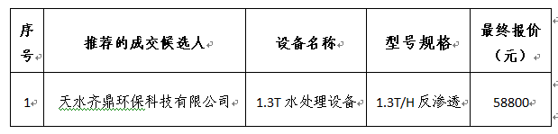 甘肃电器科学研究院水处理设备采购项目采用询价采购的方式进行。询价采购小组于2019年8月28日确定供应商,现将成交结果公布如下: