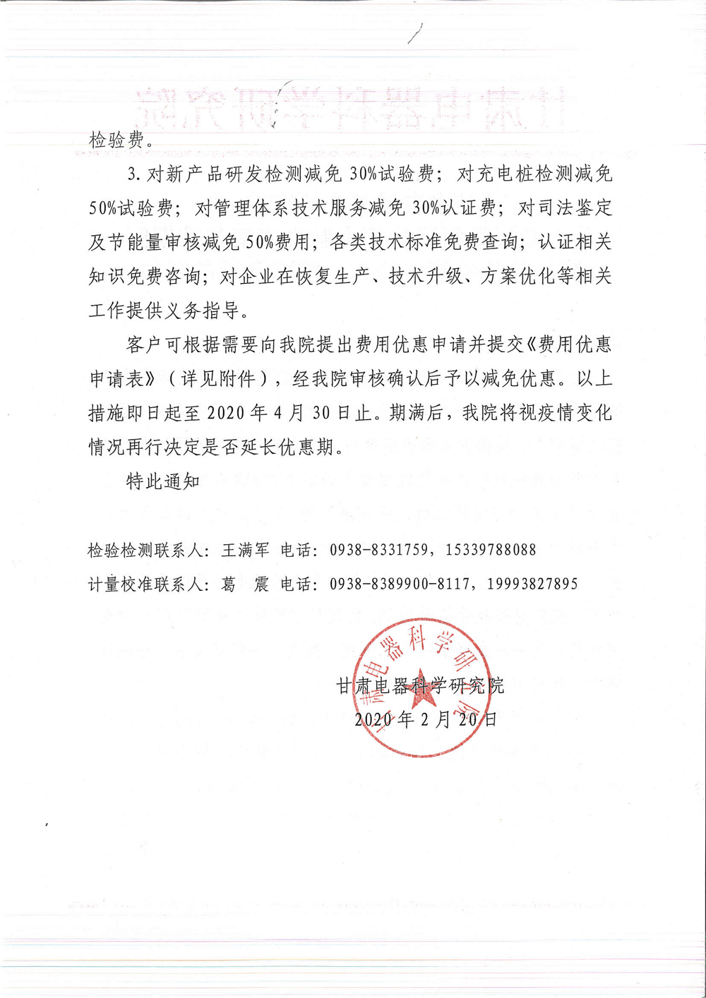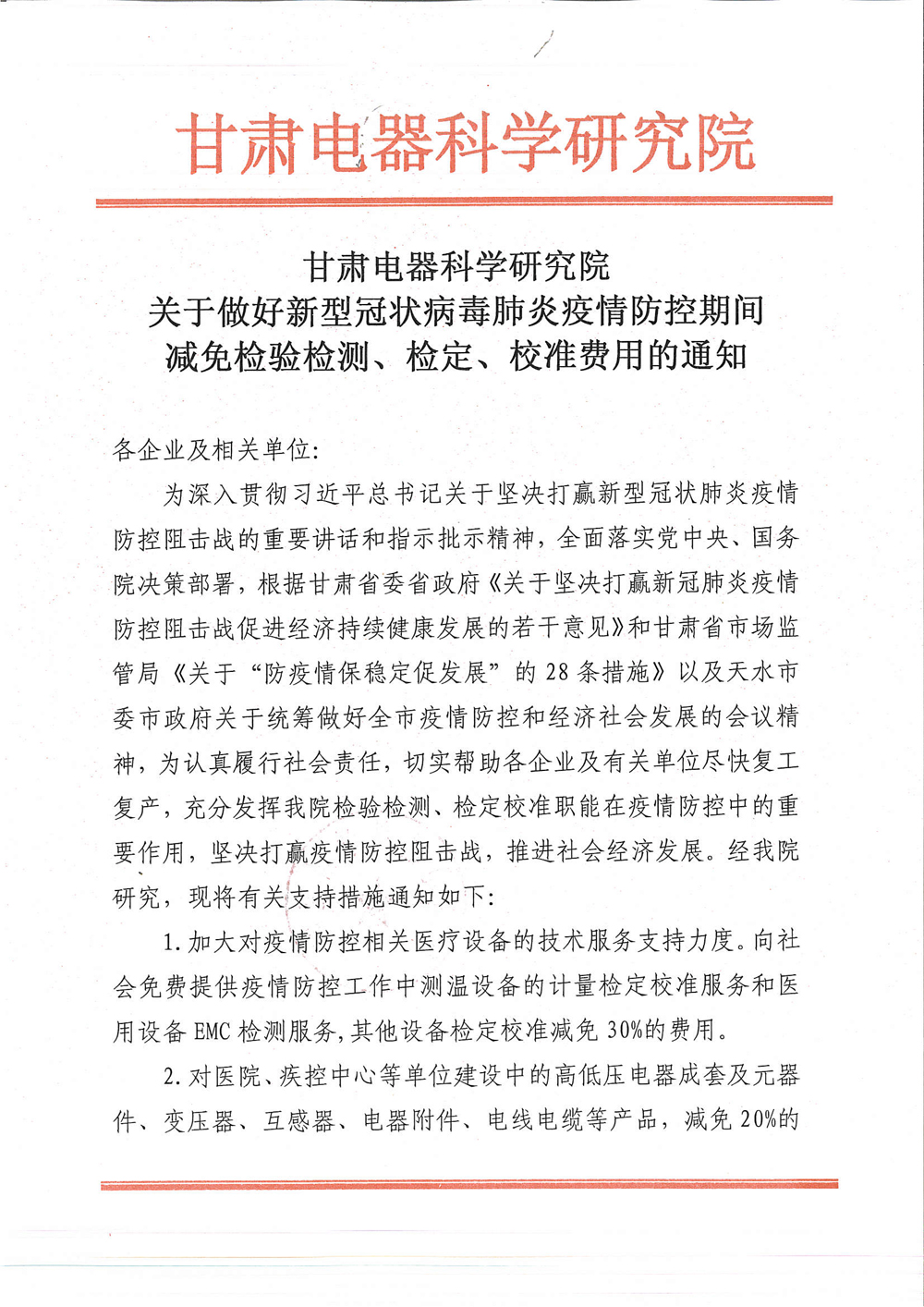 甘肃电器科学研究院关于做好新型冠状病毒肺炎疫情防控期间减免检验检测、检定、校准费用的通知