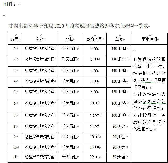 甘肃电器科学研究院现以市场询价方式采购检验报告热熔封套一批。欢迎依法在中华人民共和国注册及经营,财务独立,运作合法,遵守国家有关法律、法规,具有相应资格,有能力提供货物及服务,并能提供及时完善后期服务保障的供应商前来参加。